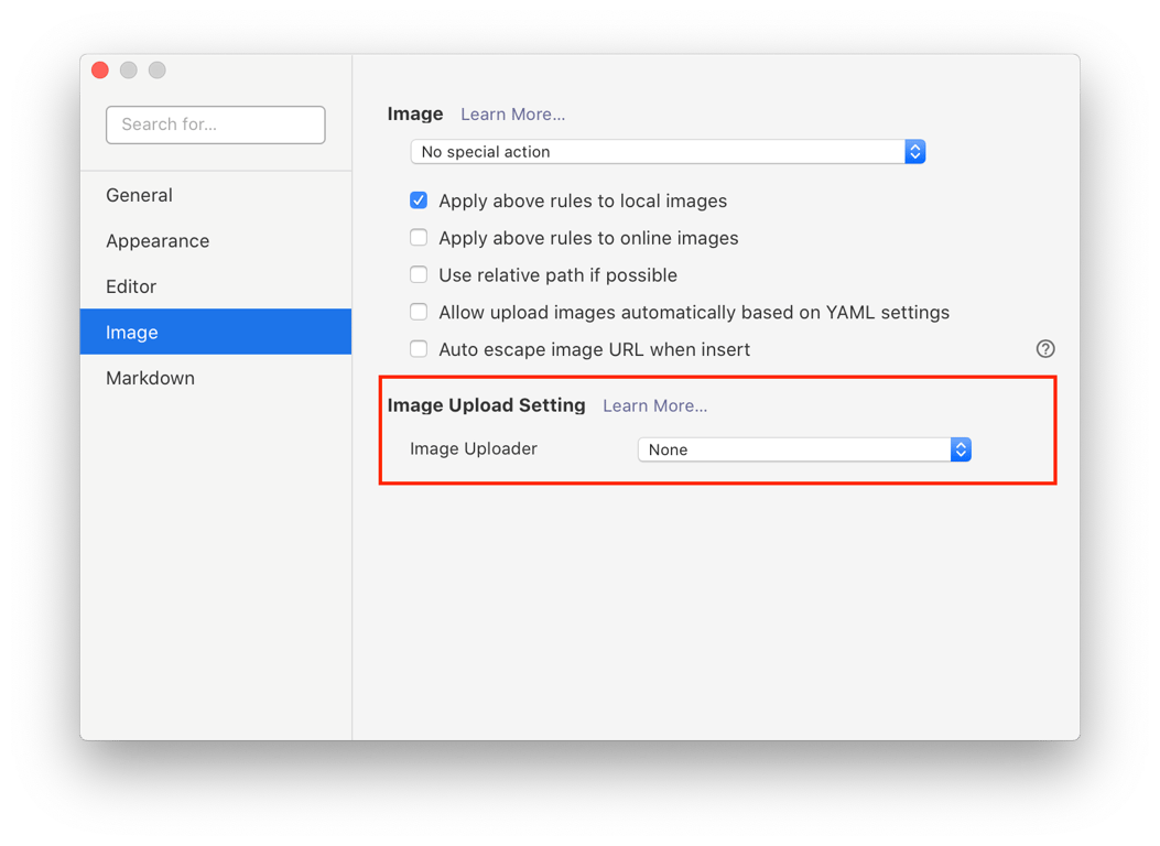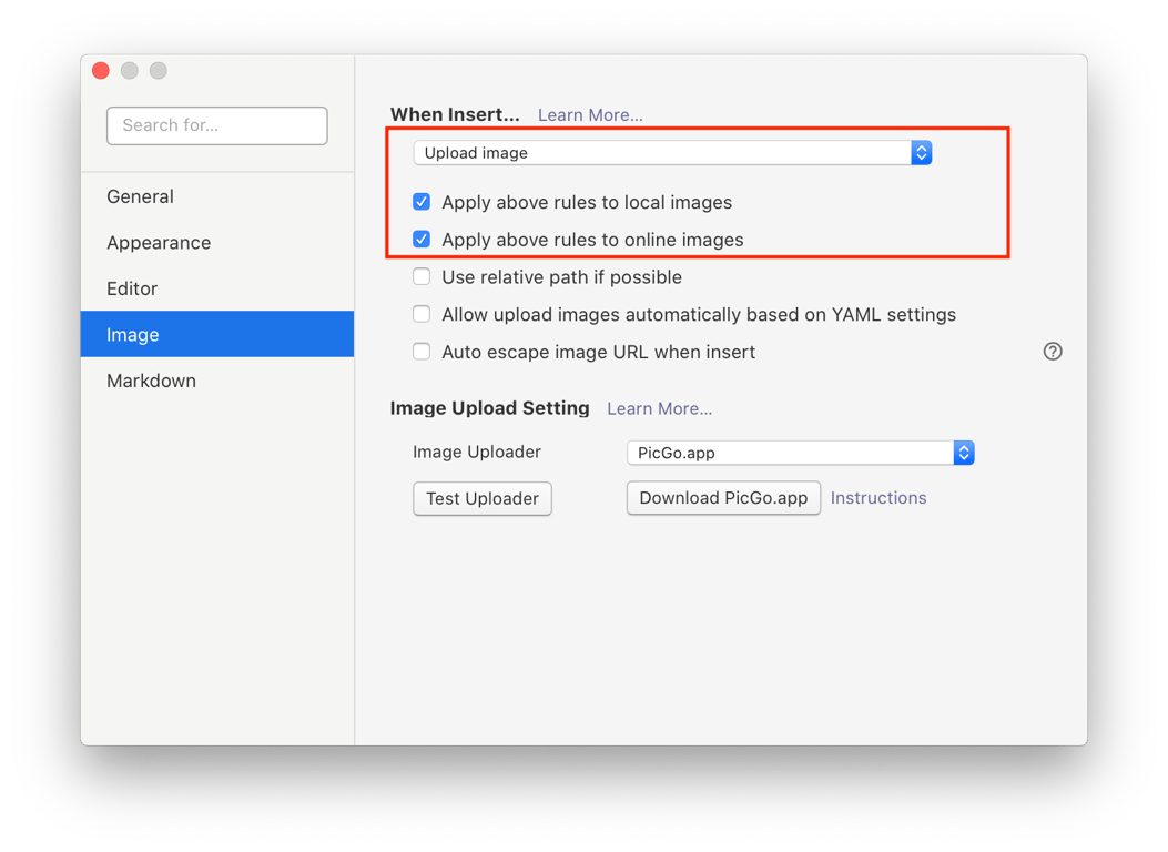 用户可以告诉 Typora 在插入时自动上传图片(包括从菜单、触摸栏插入图片,通过复制和粘贴或拖放)。要启用这一功能,请在 "插入时...... "选项下选择 "上传图片",如下截图所示。