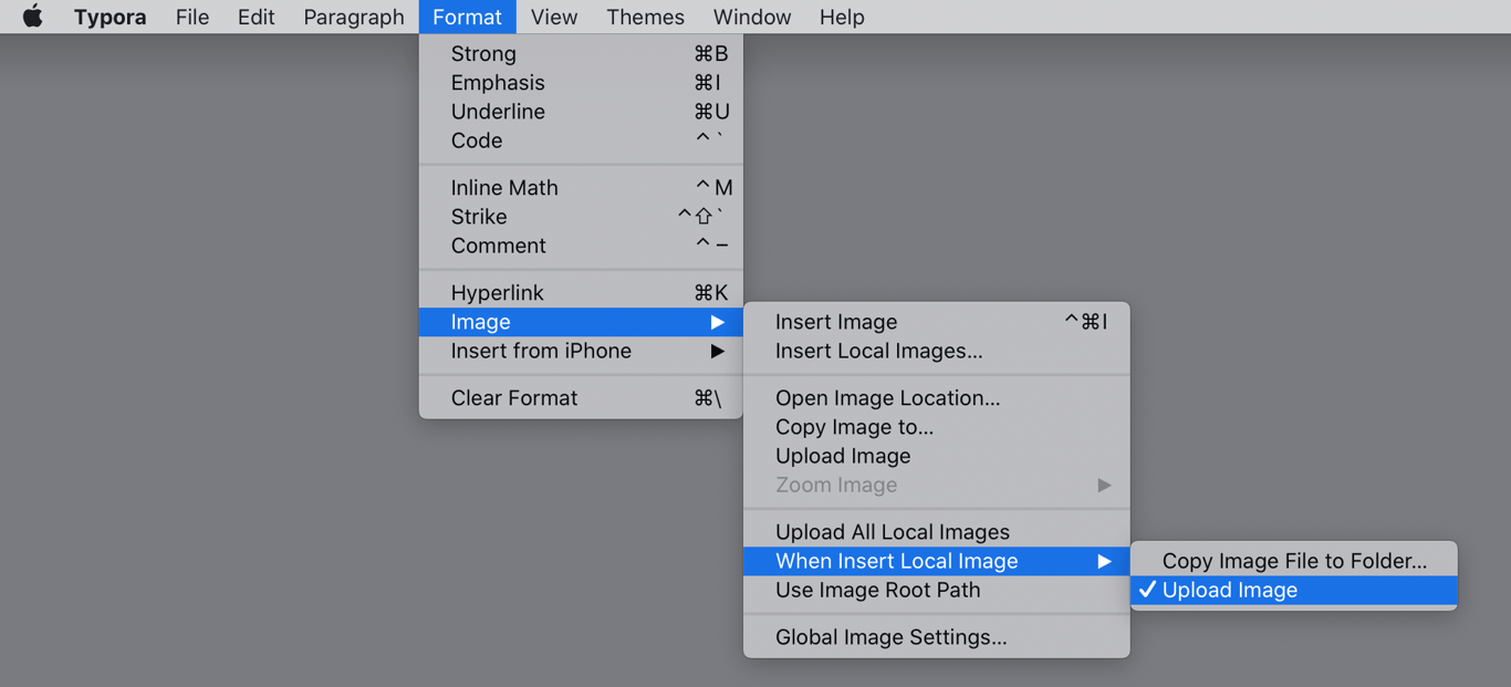 在 Typora 的新版本中(≥ 0.9.9.32 on macOS or 0.9.84 on Windows / Linux),我们增加了一个 "上传图片 "的功能,通过第三方应用程序或脚本将图片上传到云图像存储。