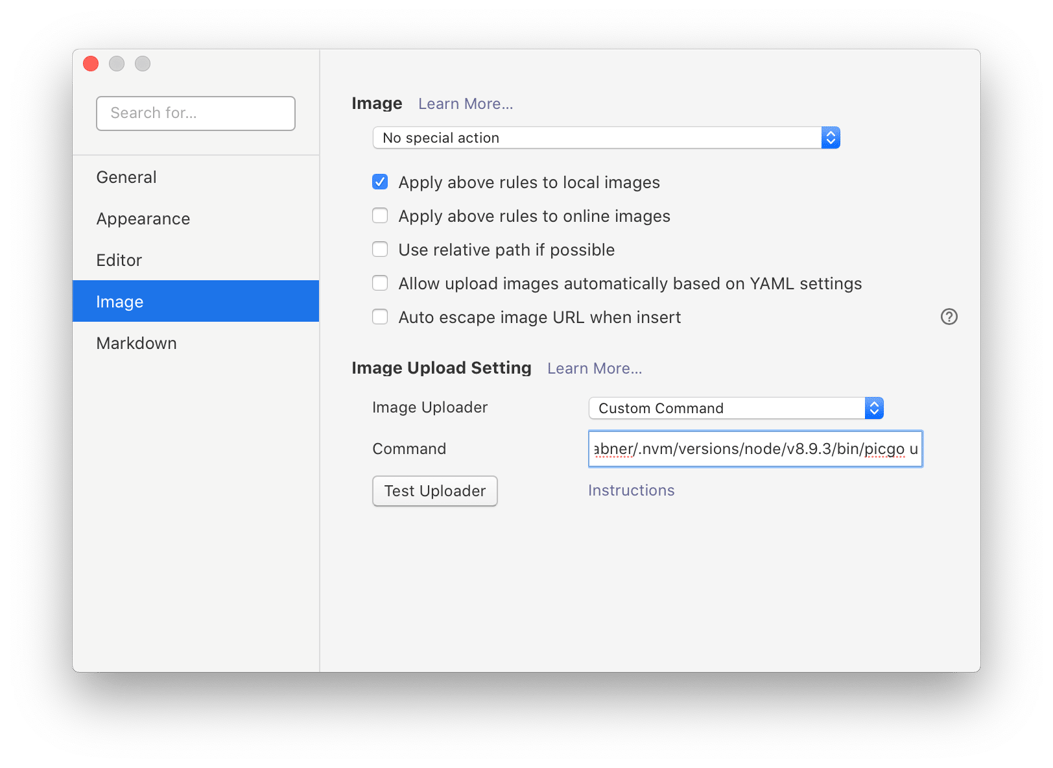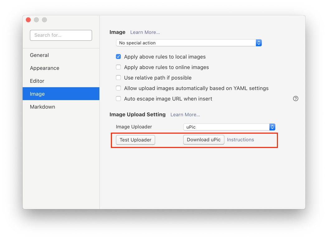 选择一个选项后,你可能需要下载和安装所需的应用程序,做简单的配置,你想在该应用程序上托管你的图像的云存储,然后点击 "Test Uploader "来测试 Typora 是否可以使用当前的服务和配置上传本地图像。
