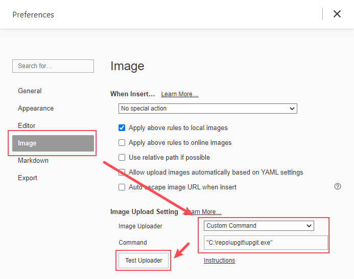 移动到 Image 。选择 Custom Command 作为你的 Image Uploader 。