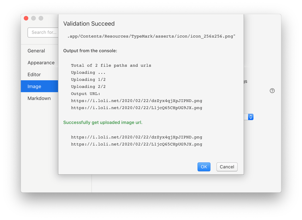 通过点击 "Test Uploader "按钮,Typora 将尝试使用当前配置上传测试图像,你可以在下面的 "Validation "对话框中看到细节、错误信息和上传后的最终 URL 结果。