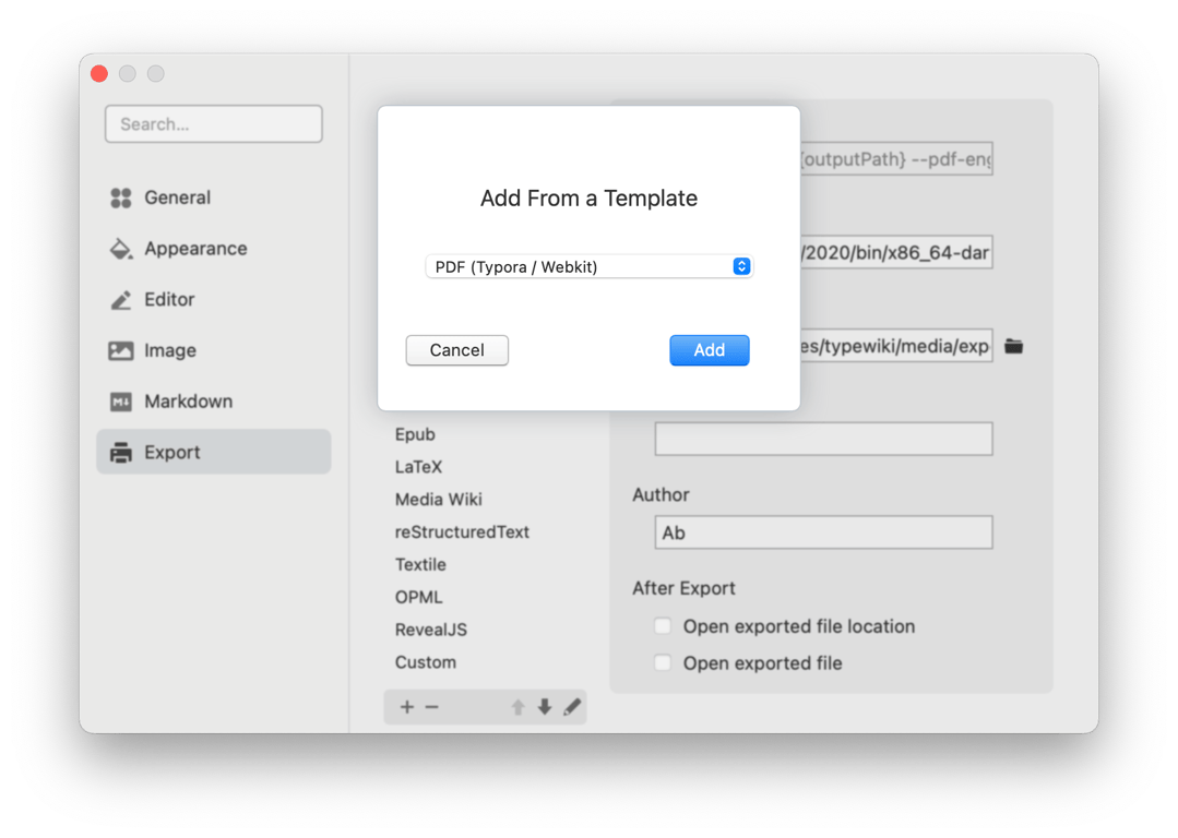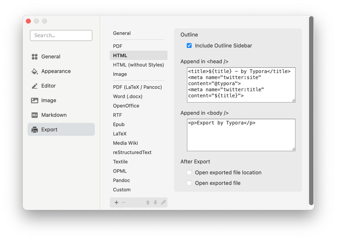 标签下,Typora 允许你定制你的导出项目,包括重新排序,重新命名导出项目,根据你的需要添加和删除导出项目。这些变化将被应用于 文件