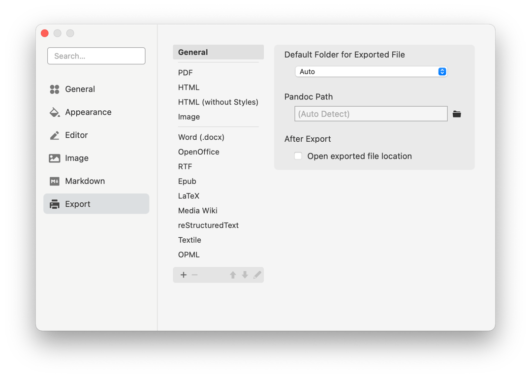 如果你想把当前文档导出为 pandoc 支持的格式,但不包括在 Typora 的导出菜单中,你可以在偏好设置中配置这样一个选项。
