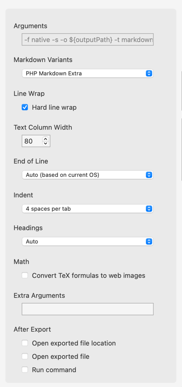 你还可以改变导出的 markdown 文件的选项,包括换行、行宽、缩进、unicode 等。